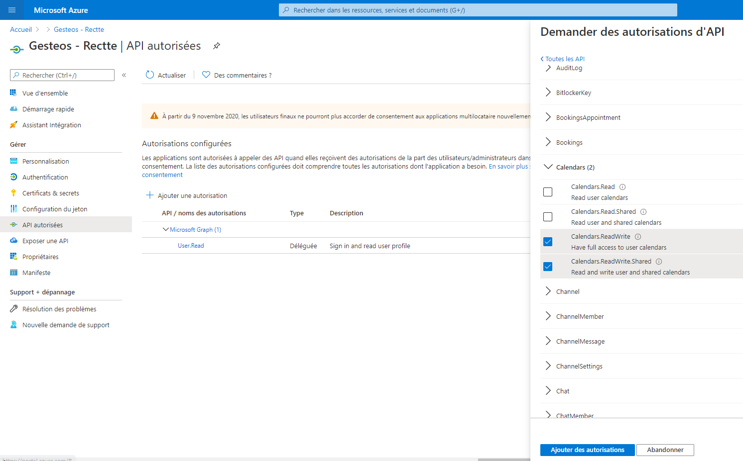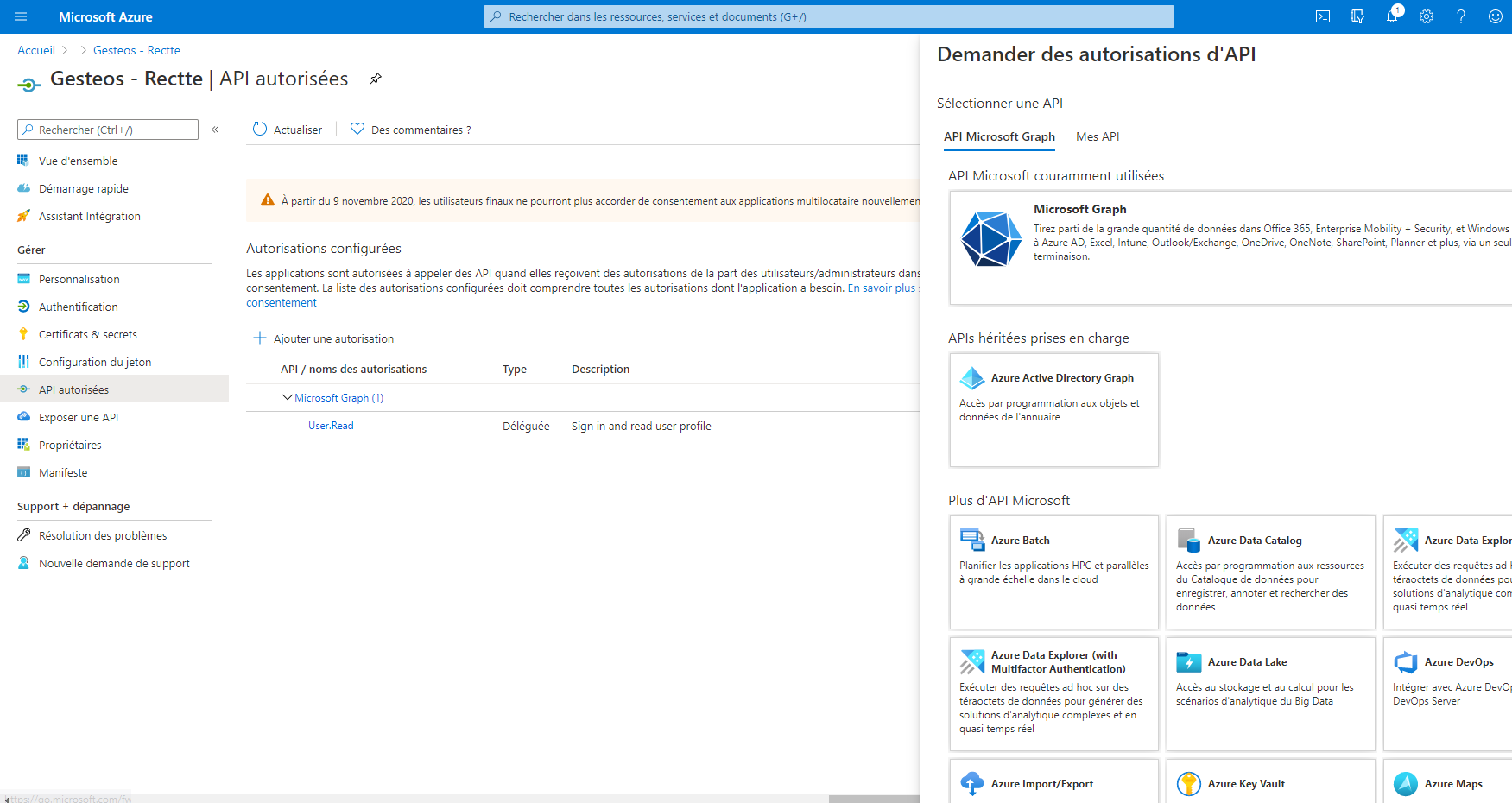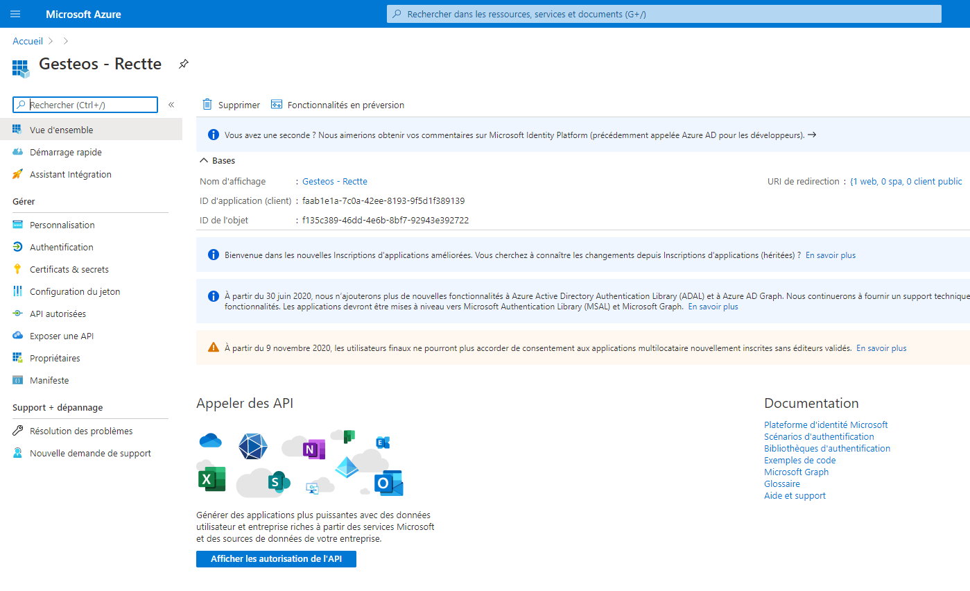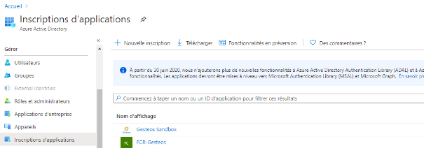 Pour ce faire Gesteos doit être identifié dans votre environnement Microsoft en inscrivant une application sur https://portal.azure.com