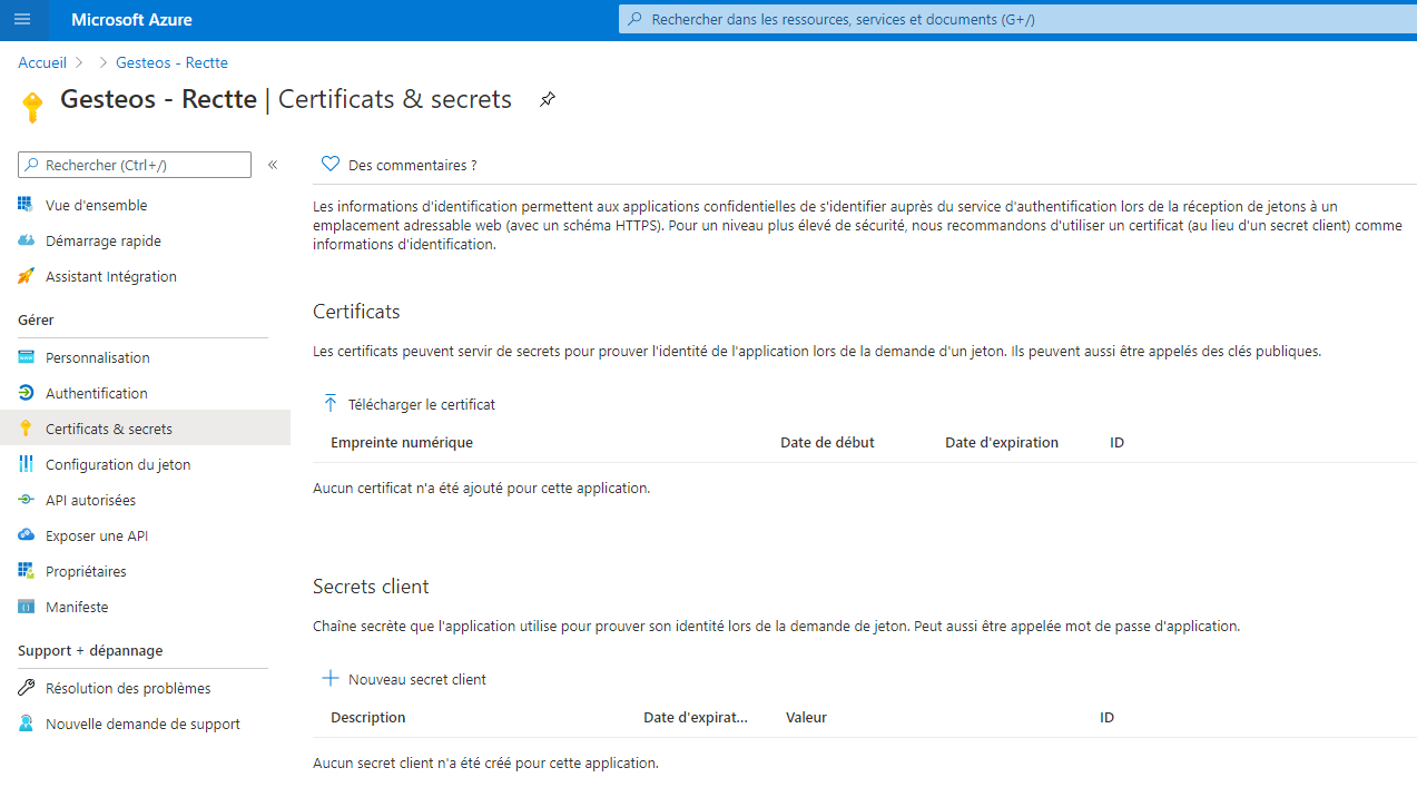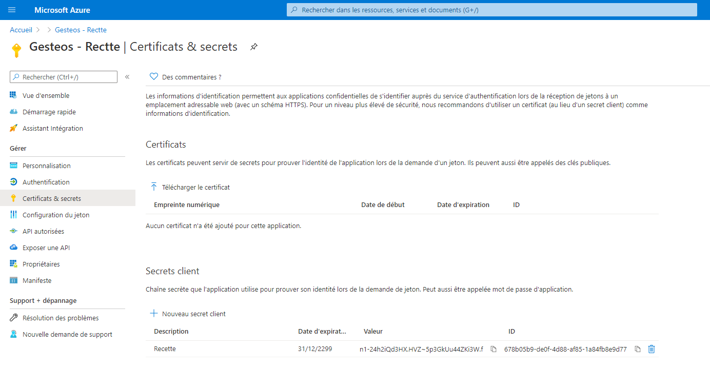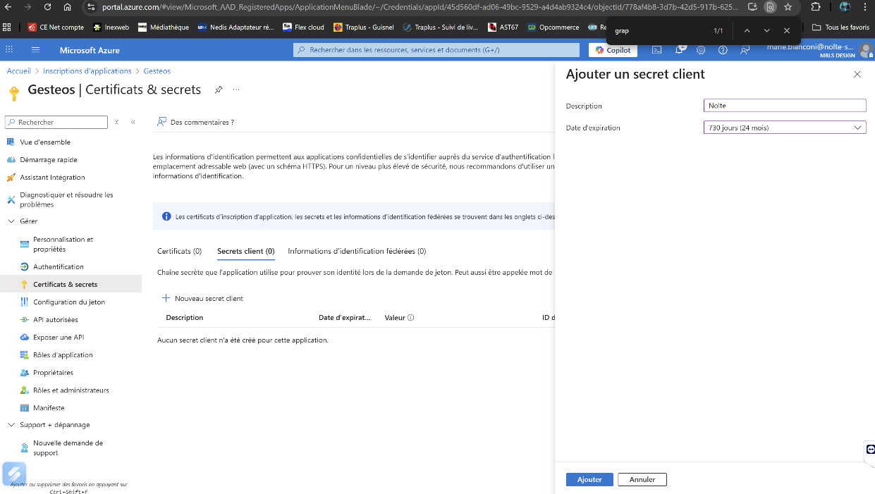 Dans le menu de gauche sélectionner « Certificats & secrets » puis « Nouveau secret client »