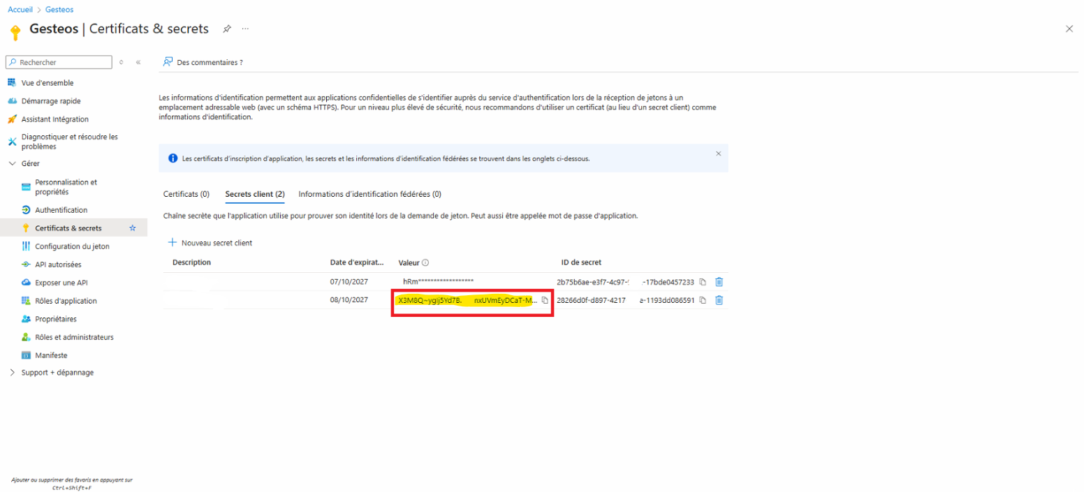 Dans le cas du Secret Value, prendre la valeur suivante mais attention celle-ci n'est accessible qu'une fois à la création du Client Secret et ensuite masqué comme sur la capture d'écran du dessus.