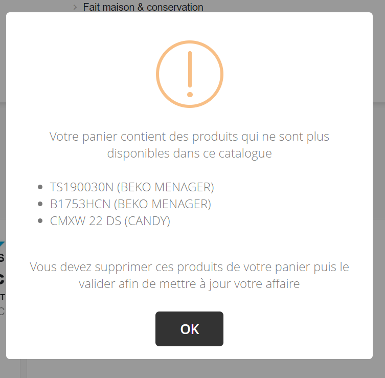 Il n'est pas possible de valider le panier de l'OAV si des articles indisponibles sont présents. Au moment de la validation, la pop-up décrite ci-dessus s'affiche en listant les produits indisponibles encore présents.