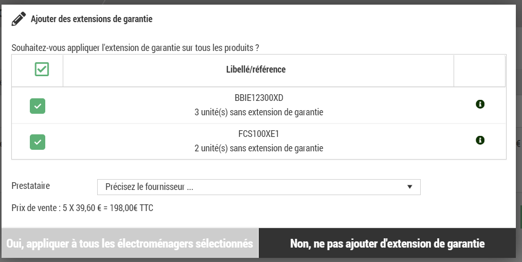 Il faut obligatoirement sélectionner le prestataire fournissant les extensions de garantie.