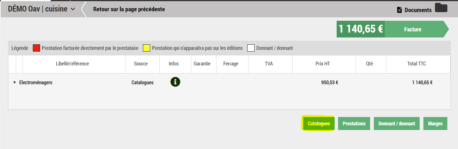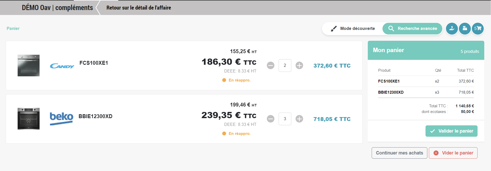 Un bouton « Valider le panier « : Permet d'enregistrer le chiffrage du panier et de retourner sur Gesteos