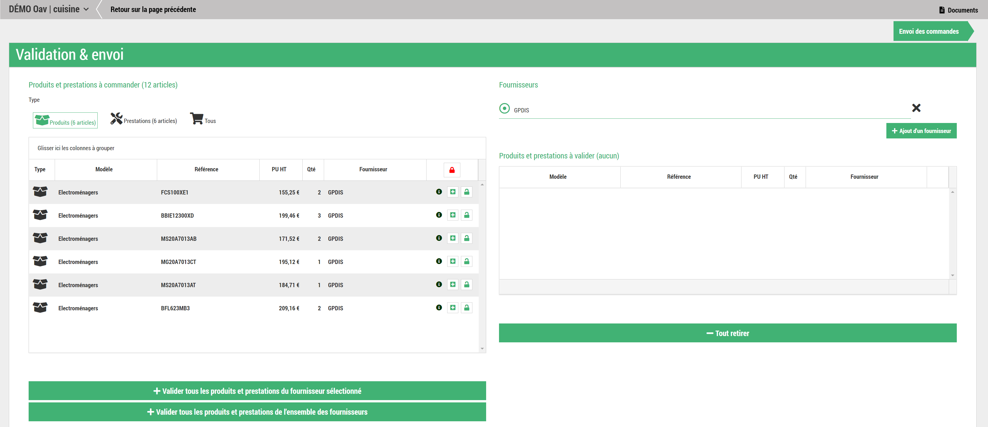 Il est possible de cliquer sur le bouton « Valider tous les produits et prestations du fournisseur sélectionné » pour ajouter tous les éléments à commander en un seul clic.