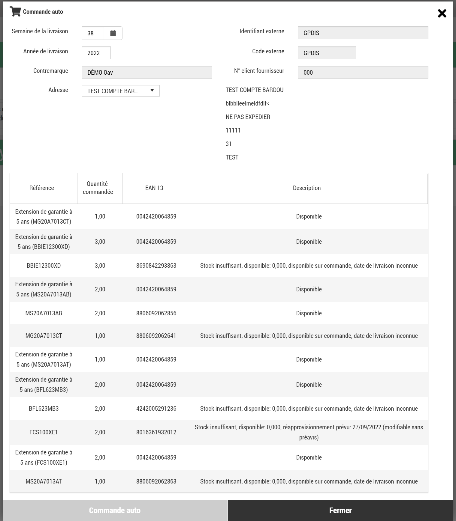 Stock insuffisant, disponible : <quantité disponible>, disponible sur commande, <date de livraison> : L'article est reconnu mais n'est pas disponible en quantité suffisante pour la commande. Celui-ci est en cours de réapprovisionnement par GPDIS à la date de livraison indiquée.