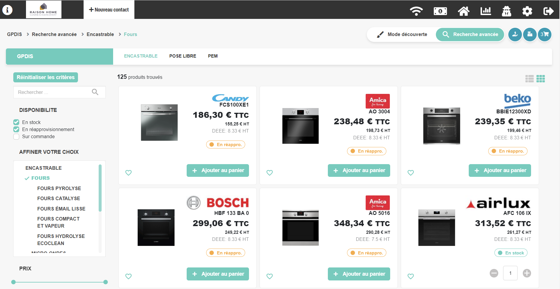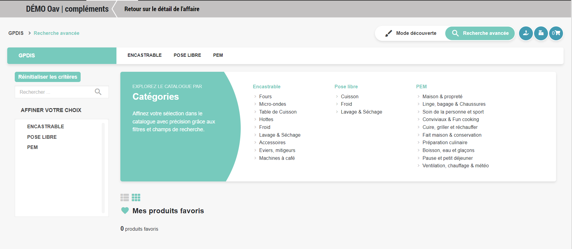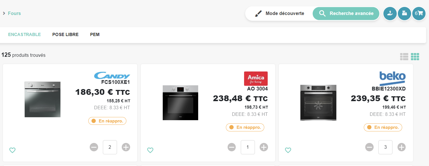- Le mode découverte : Permet de sélectionner rapidement des articles selon des catégories prédéfinies (Four, micro-ondes, Froid, ...). Ce mode permet d'orienter la sélection des électroménagers grâce à ces rubriques.