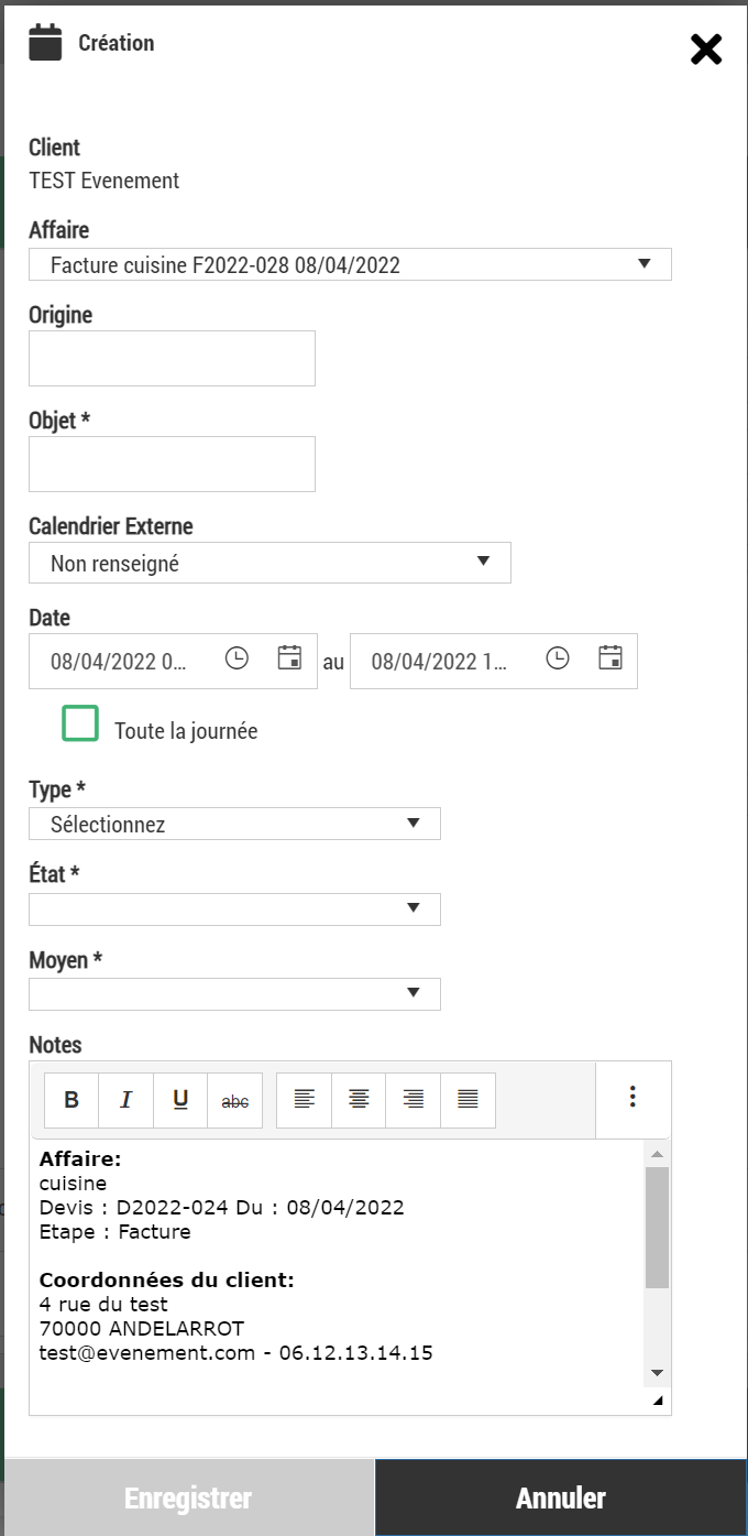 Notes : Une zone de texte pouvant être complétée. Celle-ci indique par défaut l'affaire et le contact concerné par l'événement.