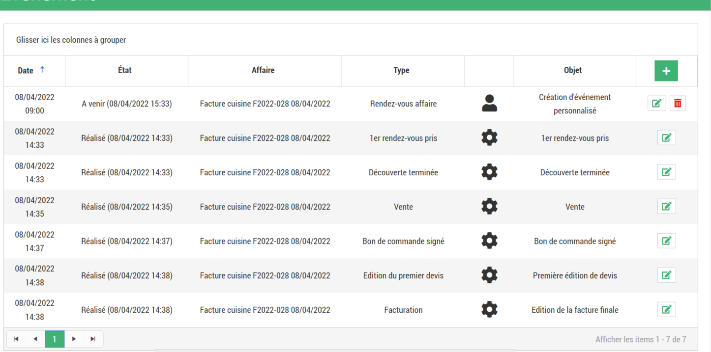 Le module évènement permet de saisir pour un contact ou une affaire, des évènements automatiques ou personnalisés qui peuvent être liés avec un agenda (Google ou Microsoft).