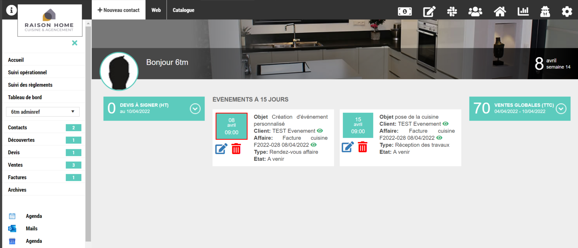 - La page d'accueil affiche les prochains événements « à venir » sur les 15 jours à compter de la date du jour. Il est possible de consulter la fiche client ou affaire concernée, de les modifier ou de les supprimer depuis l'accueil.