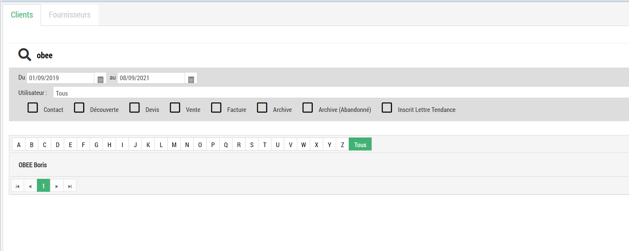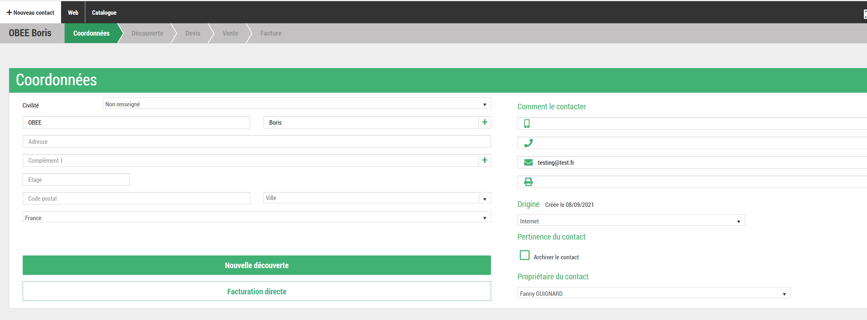 Une fois le contact trouvé, l'utilisateur peut cliquer sur nom afin d'ouvrir la page du contact et créer une nouvelle affaire ou une facturation directe pour ce client (voir capture d'écran ci-dessous)