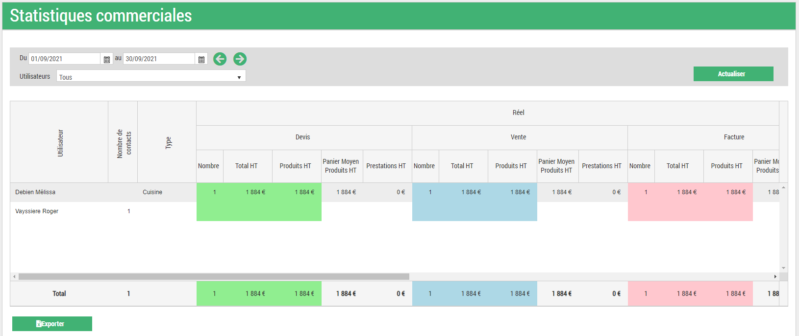 Le vendeur Roger VAYSSIERE a créé un contact dont Mélissa DEBIEN s'est servi pour créer une affaire et celle-ci apparaît bien dans ses statistiques.