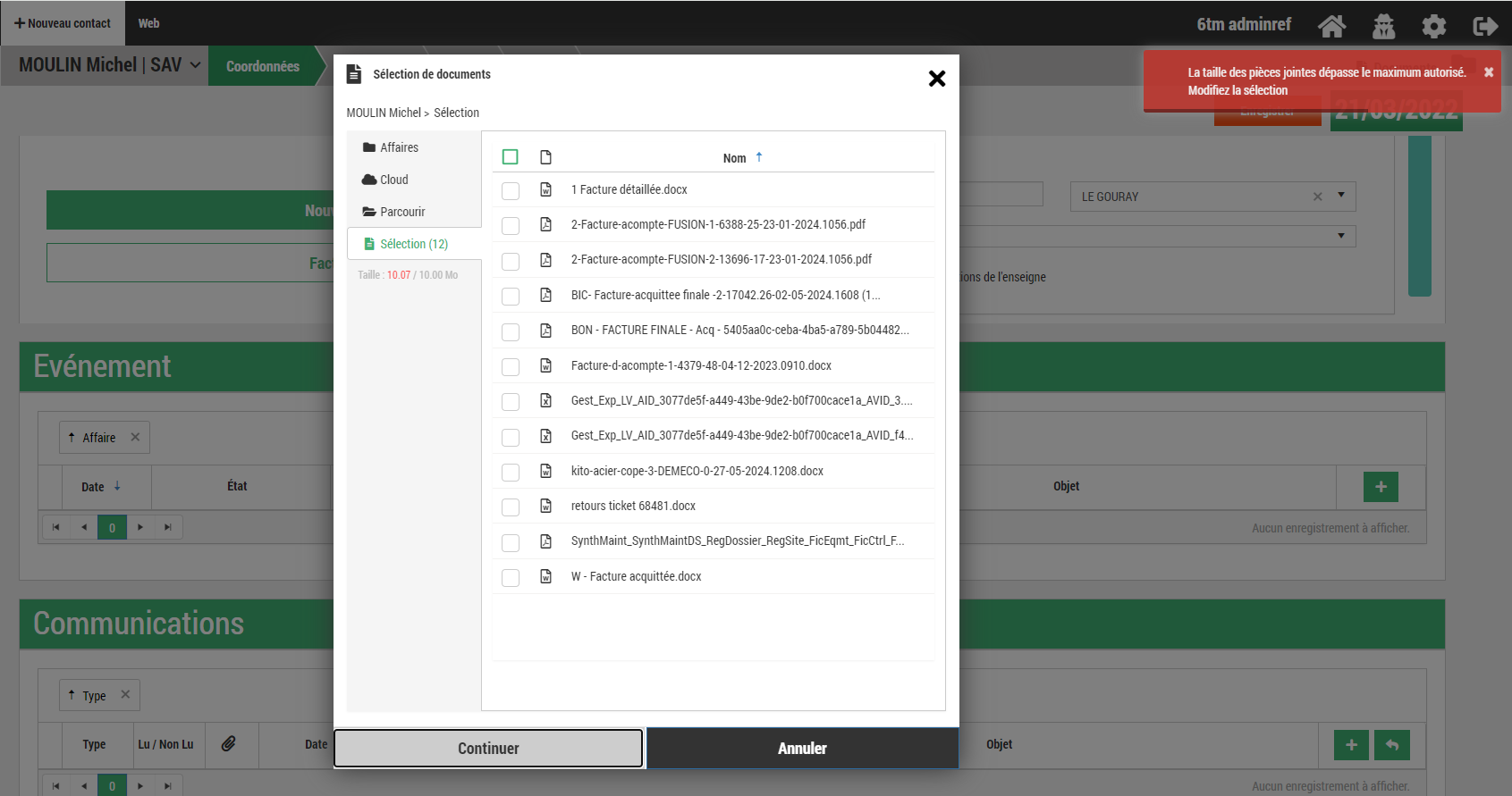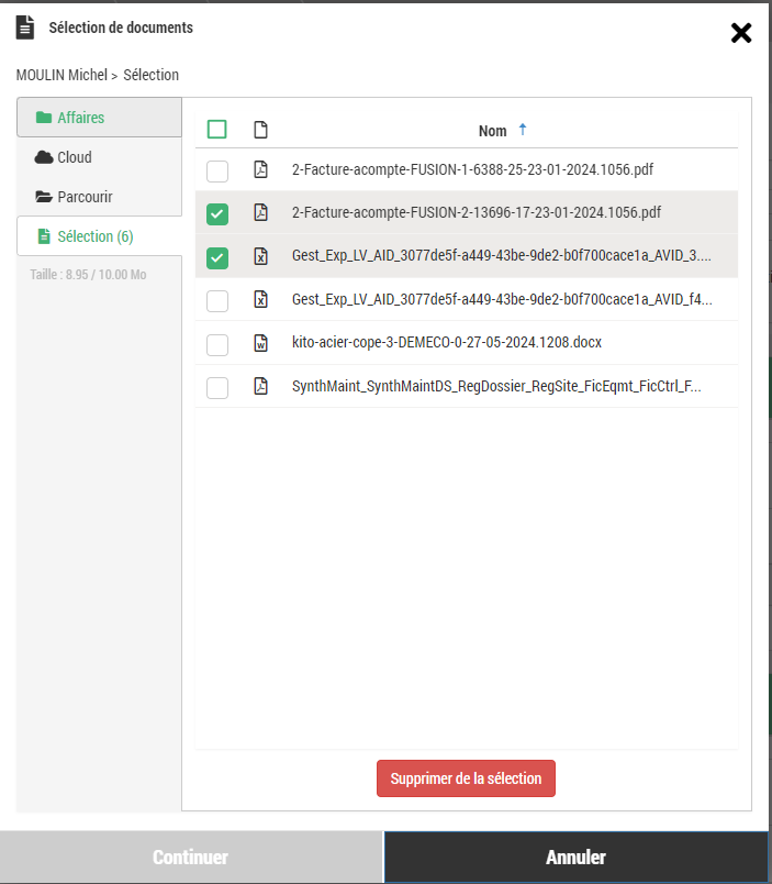 - Lorsque l'utilisateur sélectionne plus de 10Mo (limite autorisée pour les mails), le compteur présent sous les onglets devient rouge et lorsqu'il essaie de cliquer sur le bouton « Continuer », Gesteos lui indique par le biais d'un message d'erreur.