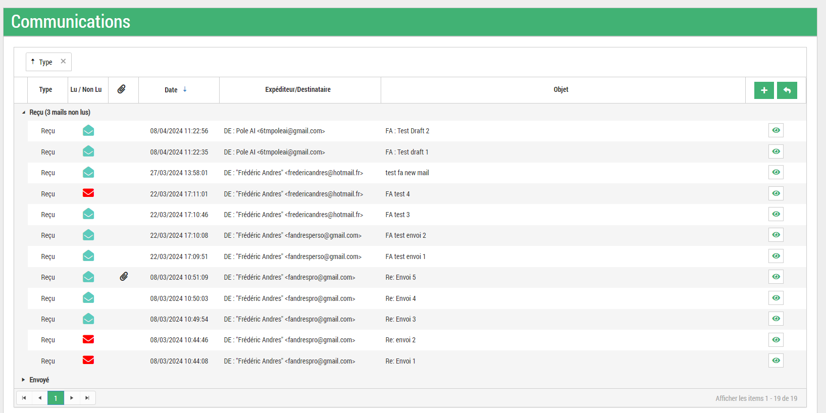 « Type » (lignes regroupées sur cette colonne par défaut) : Permet de savoir si le mail a été envoyé ou reçu.