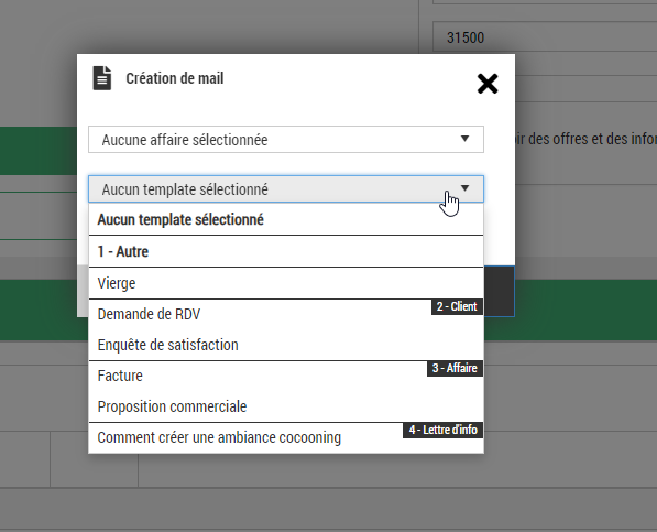 Lors de la création d'un nouveau mail depuis le sous-menu « Communications », la modale suivante apparaît :