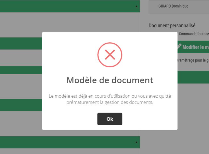 - Si le document Word est fermé avant d'enregistrer le modèle dans Gesteos, il ne sera pas possible de rouvrir le modèle par la suite car celui-ci sera bloqué (voir exemple ci-dessous). Il faudra contacter le support de niveau 2 par Mantis pour demander le déblocage du document.