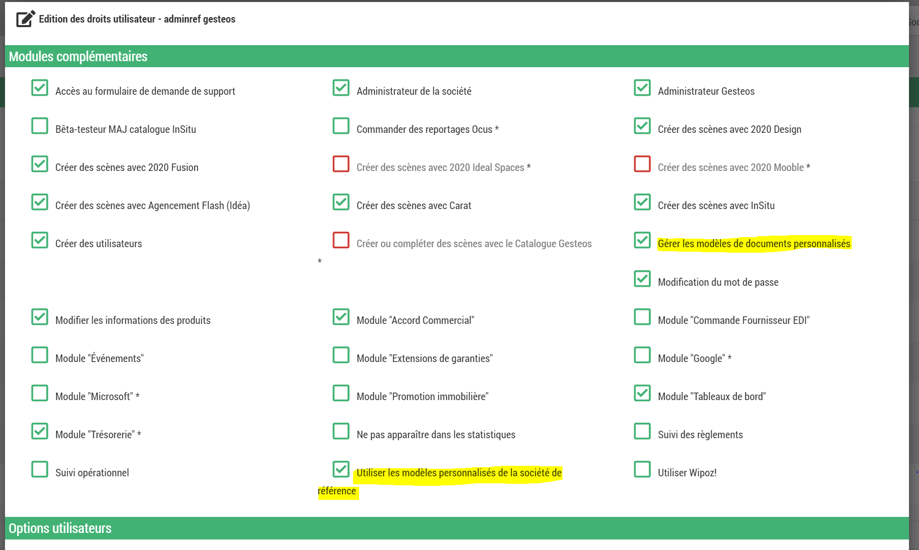 Pour que les modèles de documents personnalisés soient utilisés sur les sociétés filles, les utilisateurs doivent avoir le droit utilisateur « Utiliser les modèles personnalisés de la société de référence ». Si ce droit n'est pas coché, l'utilisateur va utiliser les modèles de document par défaut de Gesteos.