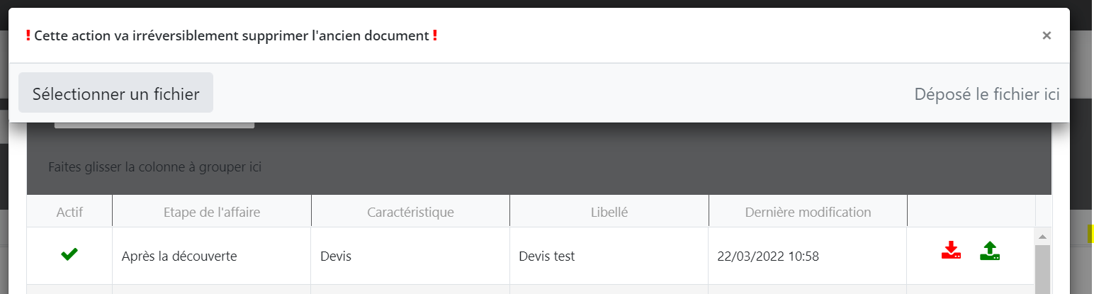 Cliquer sur le bouton vert « Upload de document » à droite de la ligne