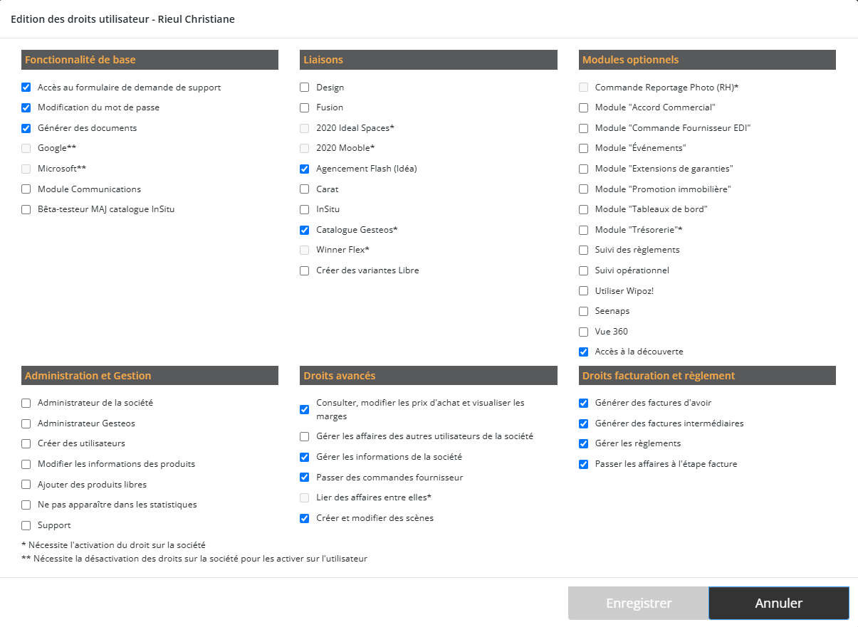 Pour que les modèles de documents personnalisés soient utilisés sur les sociétés filles, les utilisateurs doivent avoir le droit utilisateur « générer des documents ». Si ce droit n'est pas coché, l'utilisateur ne pourra pas éditer de documents et donc utiliser les modèles personnalisés.