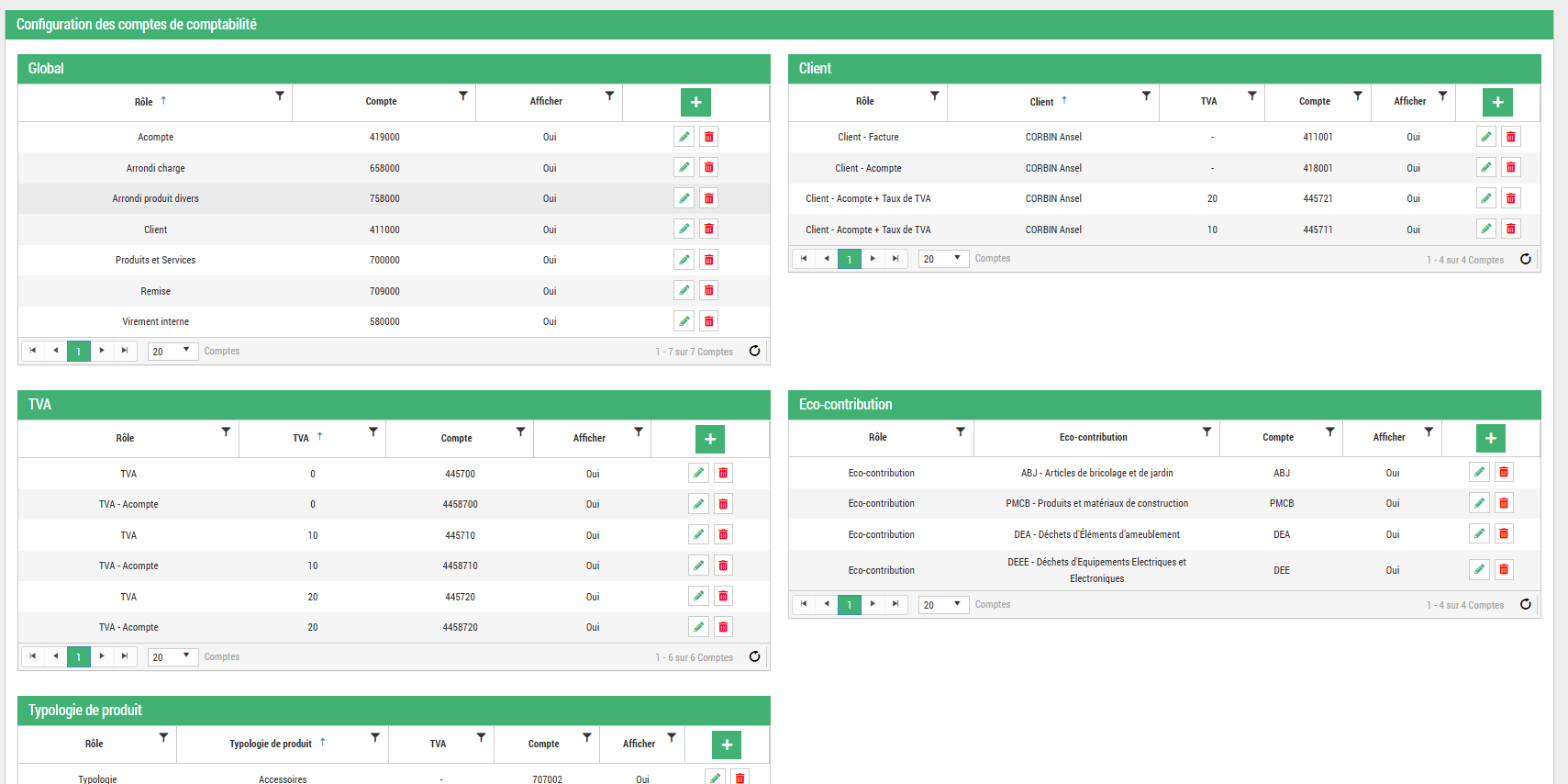 Exemple 100€ meubles à 20% de TVA => typologie meuble, taux de tva 20, on prend le compte paramétré pour la typologie Meuble ET le taux de Tva 20%.