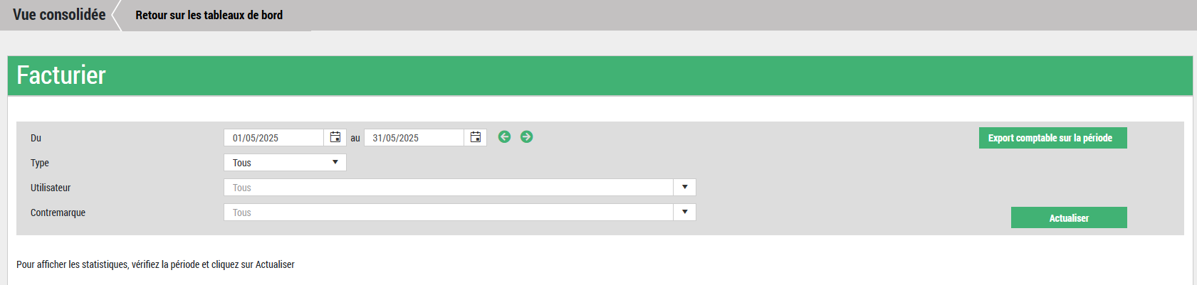 Le module permet également d'éditer un export comptable au format Excel reprenant les comptes paramétrés dans la configuration de la société concernée. Celui-ci est disponible sur l'écran du facturier grâce au bouton « Export comptable sur la période » disponible en haut à droite de l'écran.