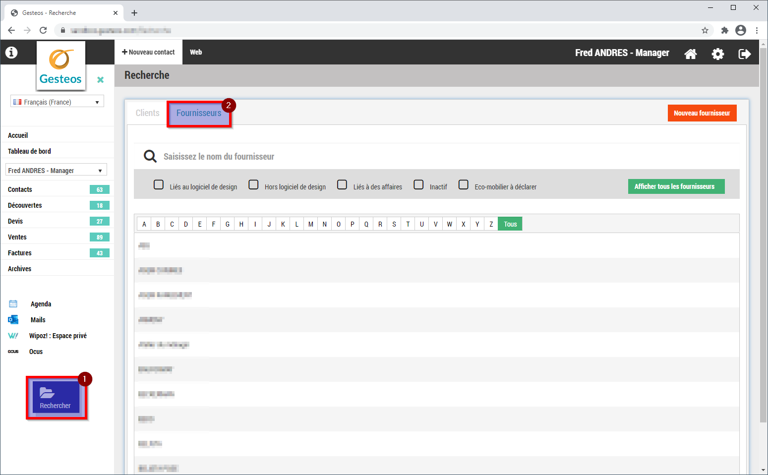 En cliquant sur le bouton « Rechercher » du menu de gauche > Onglet fournisseurs comme pour les autres fournisseurs.