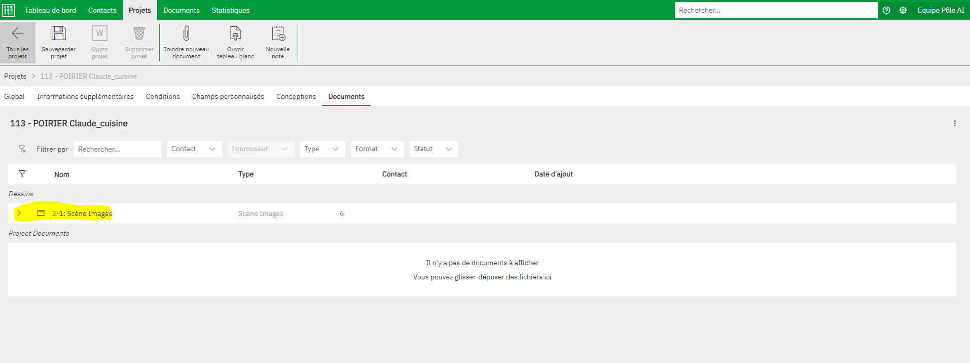 Dans le projet, cliquer sur l'onglet Documents juste à droite de celui Conceptions qui s'ouvre par défaut lors de l'arrivée sur le projet.