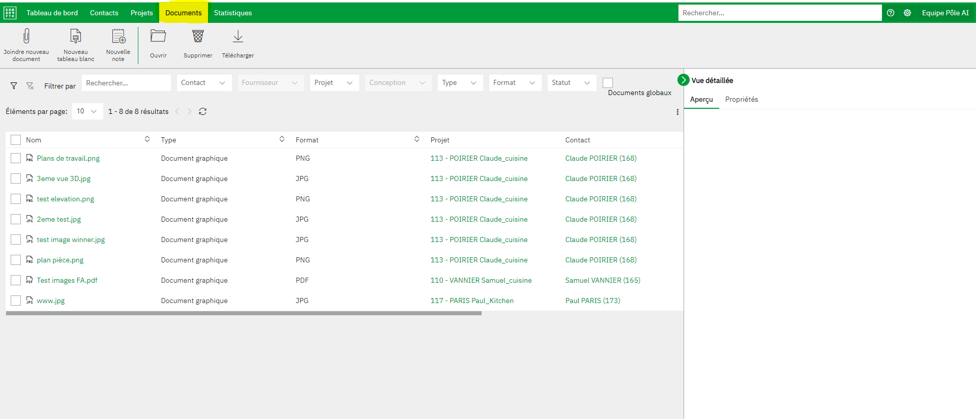- Depuis l'écran du projet, cliquer sur l'onglet Documents en haut à gauche de l'écran afin d'afficher la liste de tous les documents de tous les projets. Il est possible sur cet écran de faire des filtres pour isoler les documents voulus.