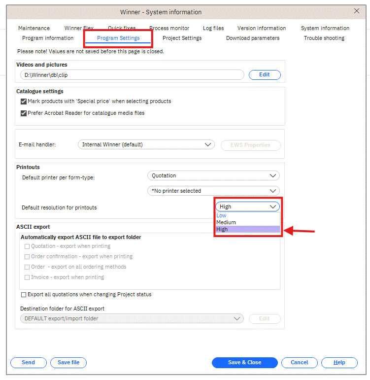 Sur la nouvelle fenêtre qui s'affiche, sélectionner l'onglet "Program Settings" et dans le menu sélectionnée la valeur souhaitée pour l'option "Default resolution for printouts". Enfin cliquer sur "Save & Close" sur chaque fenêtre afin d'enregistrer la configuration.