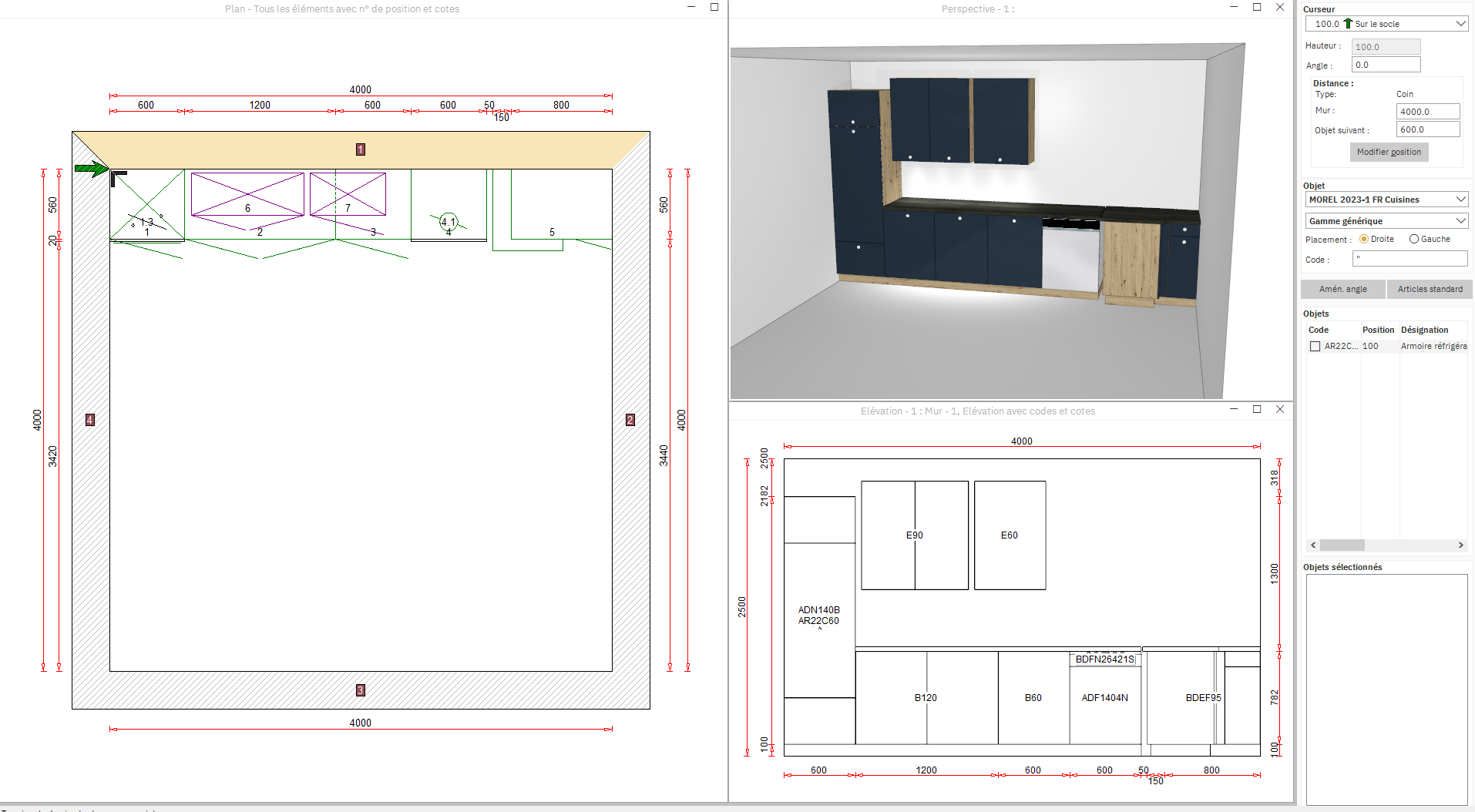 Sélectionner sur le plan, l'élévation concernée qui va se surligner en jaune et l'affichage de celle-ci va se modifier en conséquence en bas à droite de l'écran.