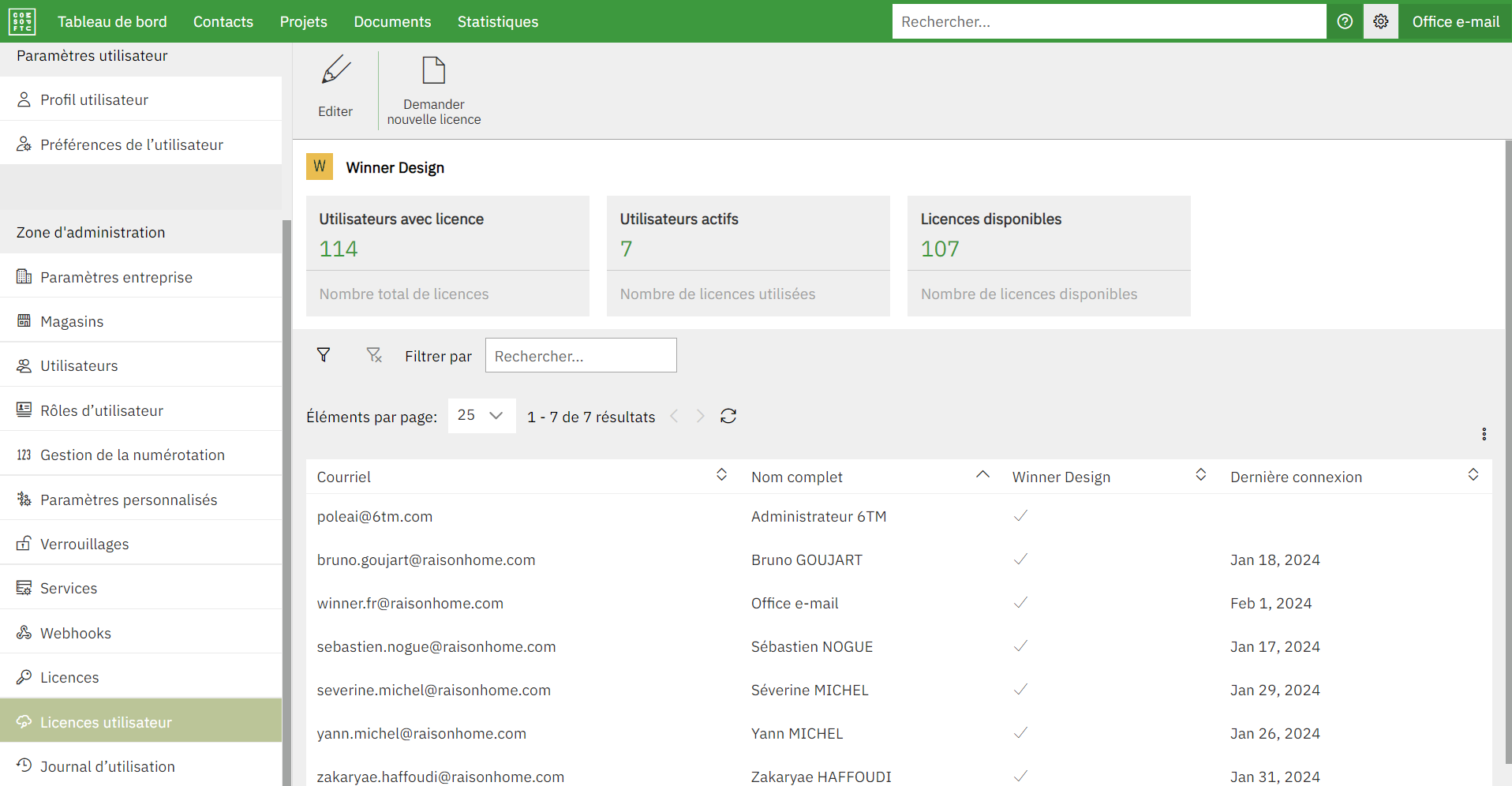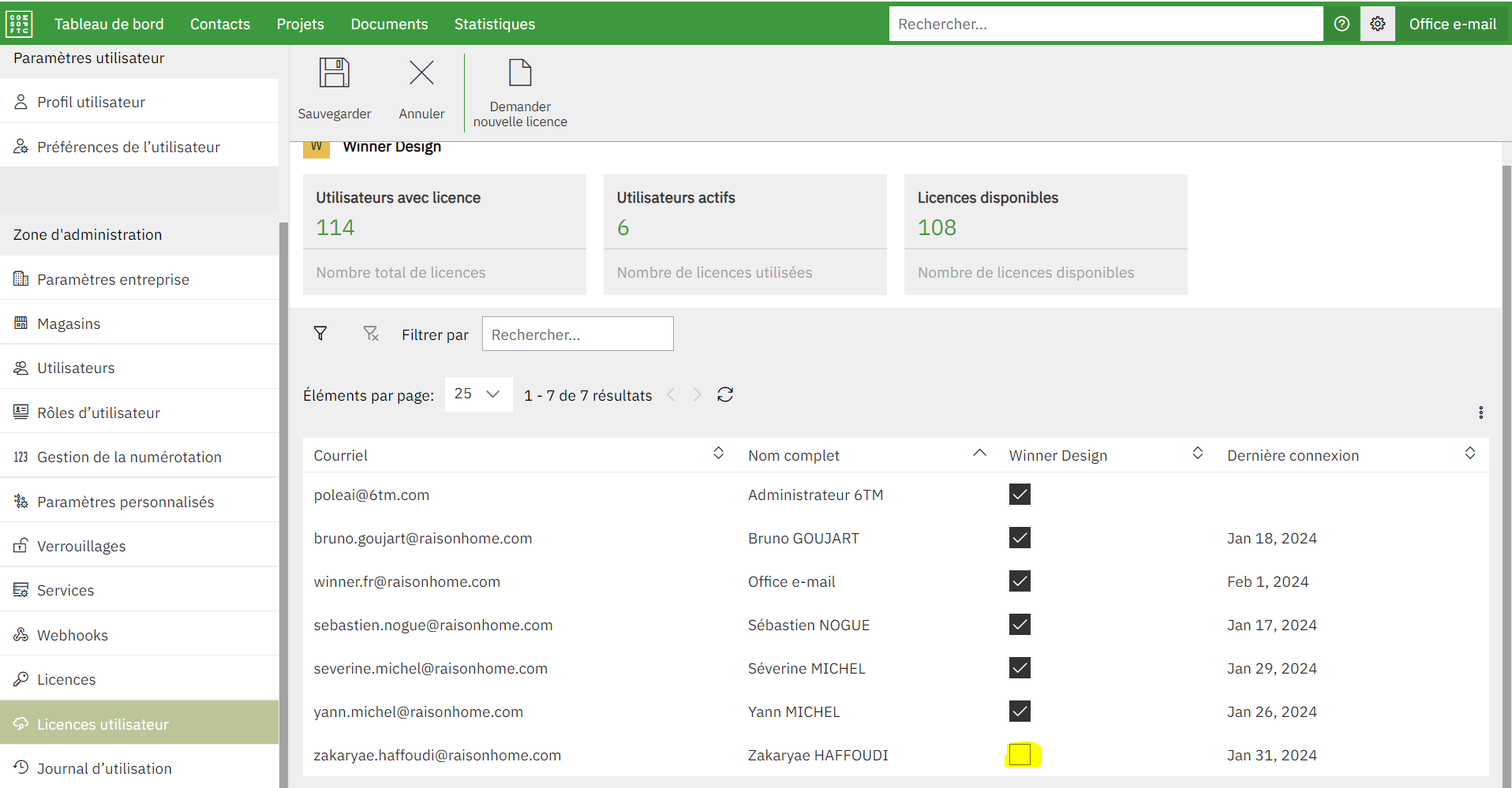 Permet de voir quels utilisateurs ont une licence active (Colonne « Winner Design » cochée).