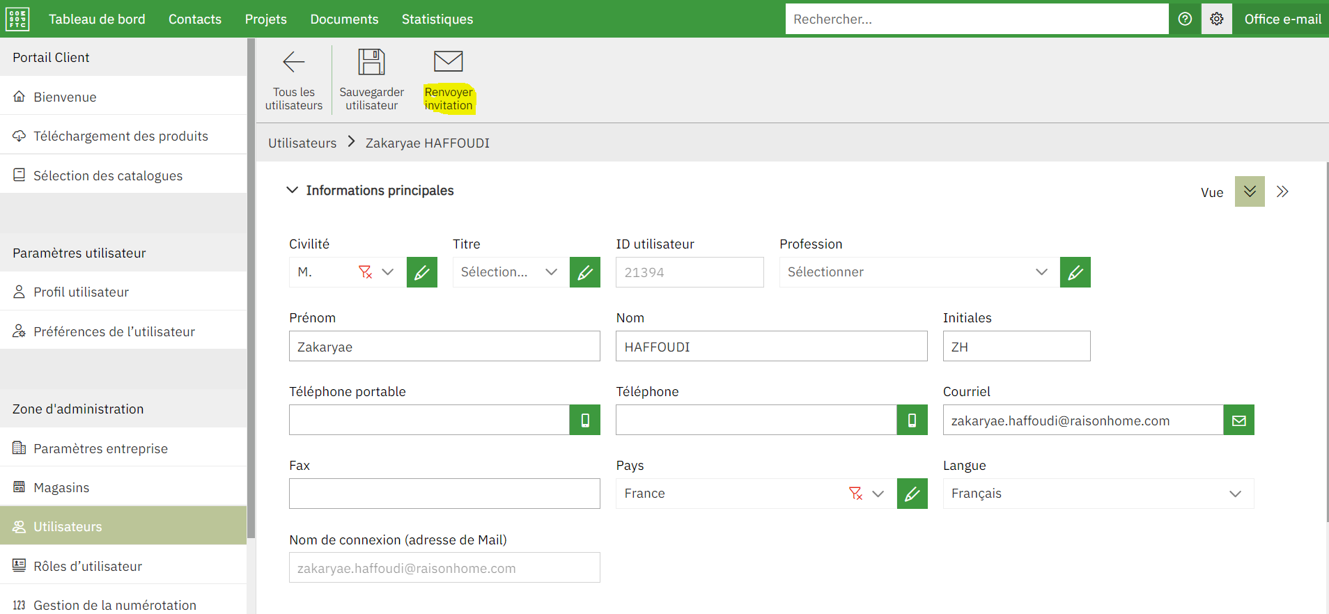 Sélectionner l'utilisateur concerné et cliquer sur le bouton « Renvoyer l'invitation » en haut de l'écran qui va envoyer un mail à l'utilisateur avec un lien pour l'activation de son compte.
