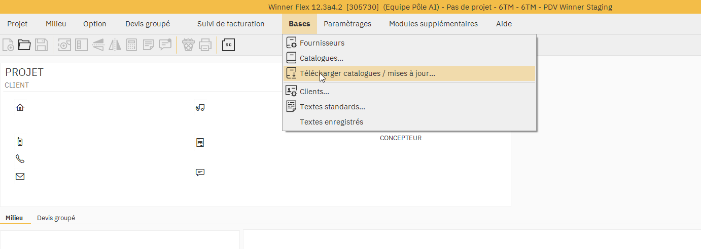 Il se peut que lors du clic sur le menu « Bases », l'option « Télécharger catalogues / mises à jour » soit grisée. Cela est dû au rôle « Pas d'accès au coeff » paramétré sur l'utilisateur dans Winner Flex (normalement corrigée par Cyncly depuis). Pour le temps de l'installation, modifier le rôle de l'utilisateur en « Tous les droits » puis fermer et relancer Winner sur l'ordinateur. Il faut alors suivre les étapes indiquées dans la finalisation de l'installation.