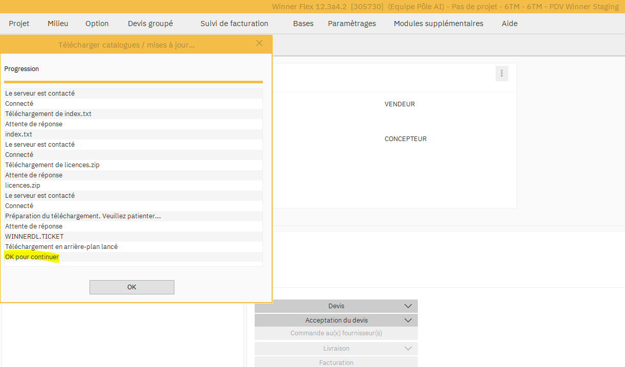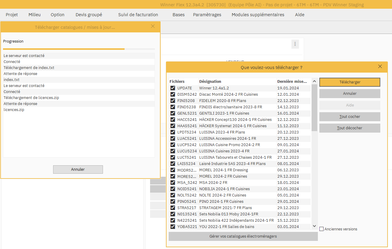 Une fois cela fait, il faut télécharger au moins un catalogue pour que Winner active ses modules externes notamment le module permettant son ouverture depuis un logiciel tiers (Gesteos).