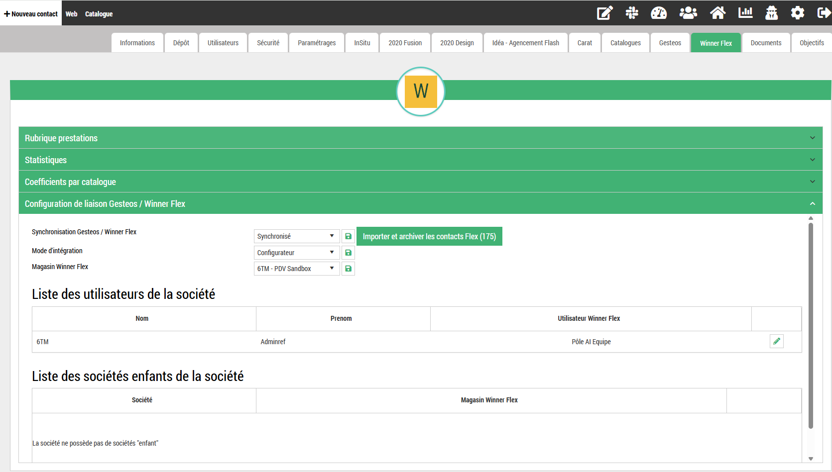 Aller sur la configuration société > Onglet Winner puis cliquer sur le sous-menu « Configuration de liaison Gesteos / Winner Flex » pour afficher l'écran suivant.