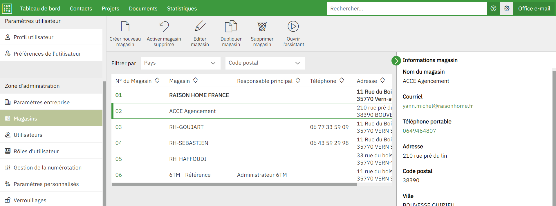 Si les informations n'ont pas été correctement saisies, il est toujours possible d'éditer les informations du magasin (sauf son numéro) ou de le supprimer en cliquant sur celui-ci et en se servant des boutons d'actions qui apparaîtront.