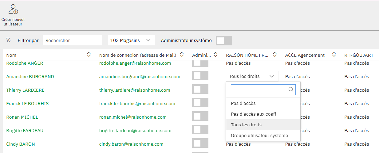 Une fois l'utilisateur créé, Winner Flex va réafficher la liste des utilisateurs. Cette liste permet de voir la liste des magasins auxquelles les différents utilisateurs ont accès. Par défaut, un utilisateur n'a aucun accès. Pour l'utilisateur créé, retrouver son magasin dans la liste puis cliquer sur le bouton « Pas d'accès » qui va afficher une liste déroulante des rôles disponibles pour le magasin.